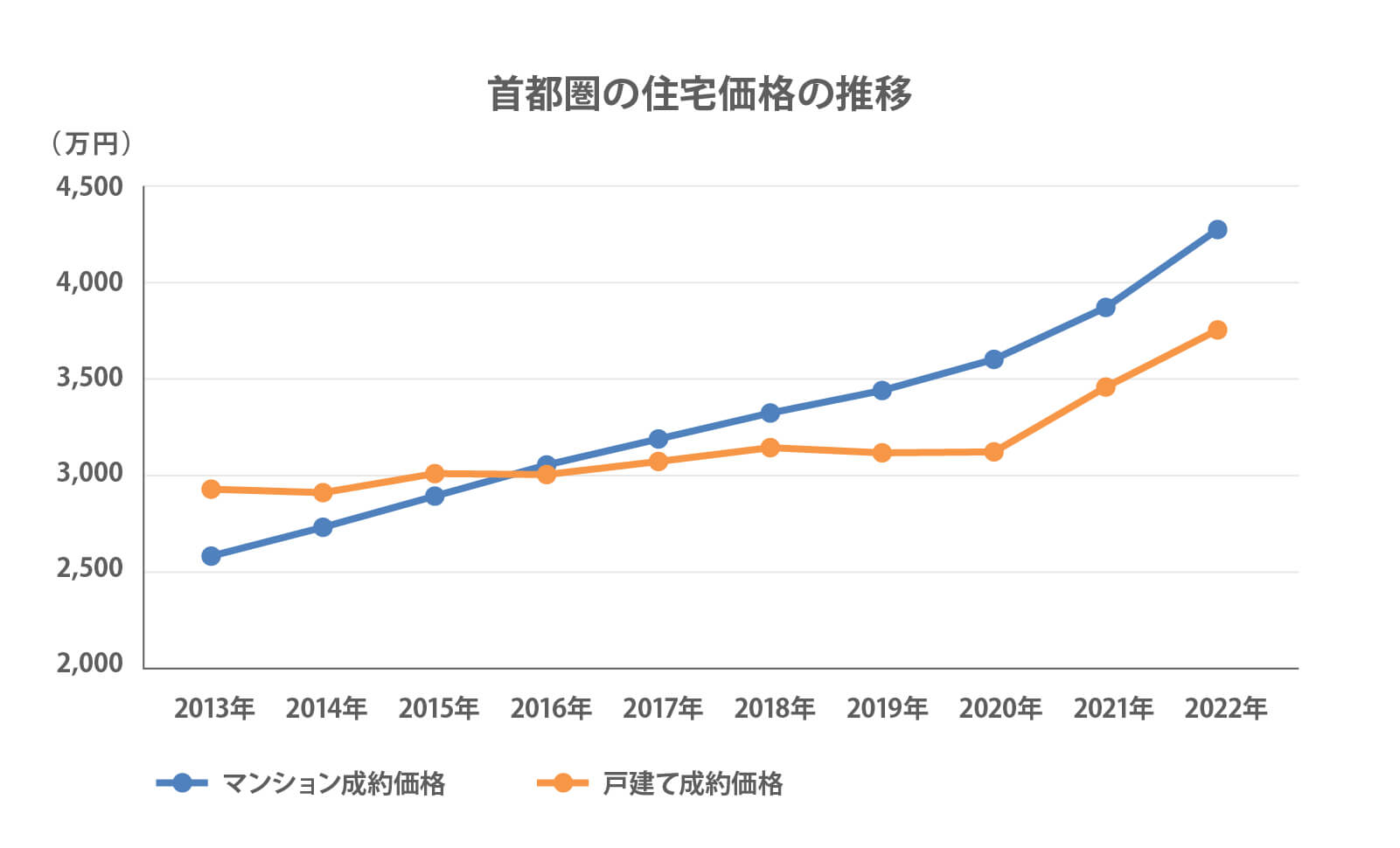 中古マンションの平均成約価格を見ると、2013年には2,589万円のところ、2022年には4,276万円まで上昇しています。